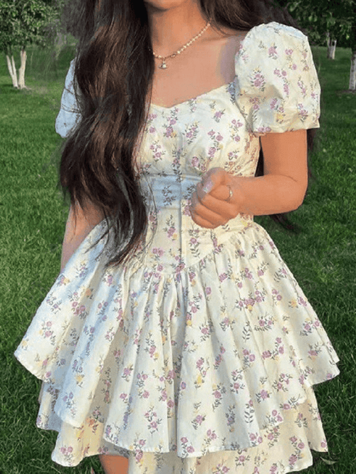 Description: Elevate your summer wardrobe with our charming Puff Sleeve Floral Corset Mini Dress. This dress combines retro vibes with a playful twist. Featuring an all-over floral print, it boasts a cinched corset waist and a tiered ruffle hemline for added flair. The concealed zip fly at the back ensures a seamless look. The flattering sweetheart neckline can be worn off the shoulder, adding a touch of allure to your ensemble. Perfect for a holiday, a night out, a festival, or a romantic date. Get ready to turn heads and make a statement wherever you go!